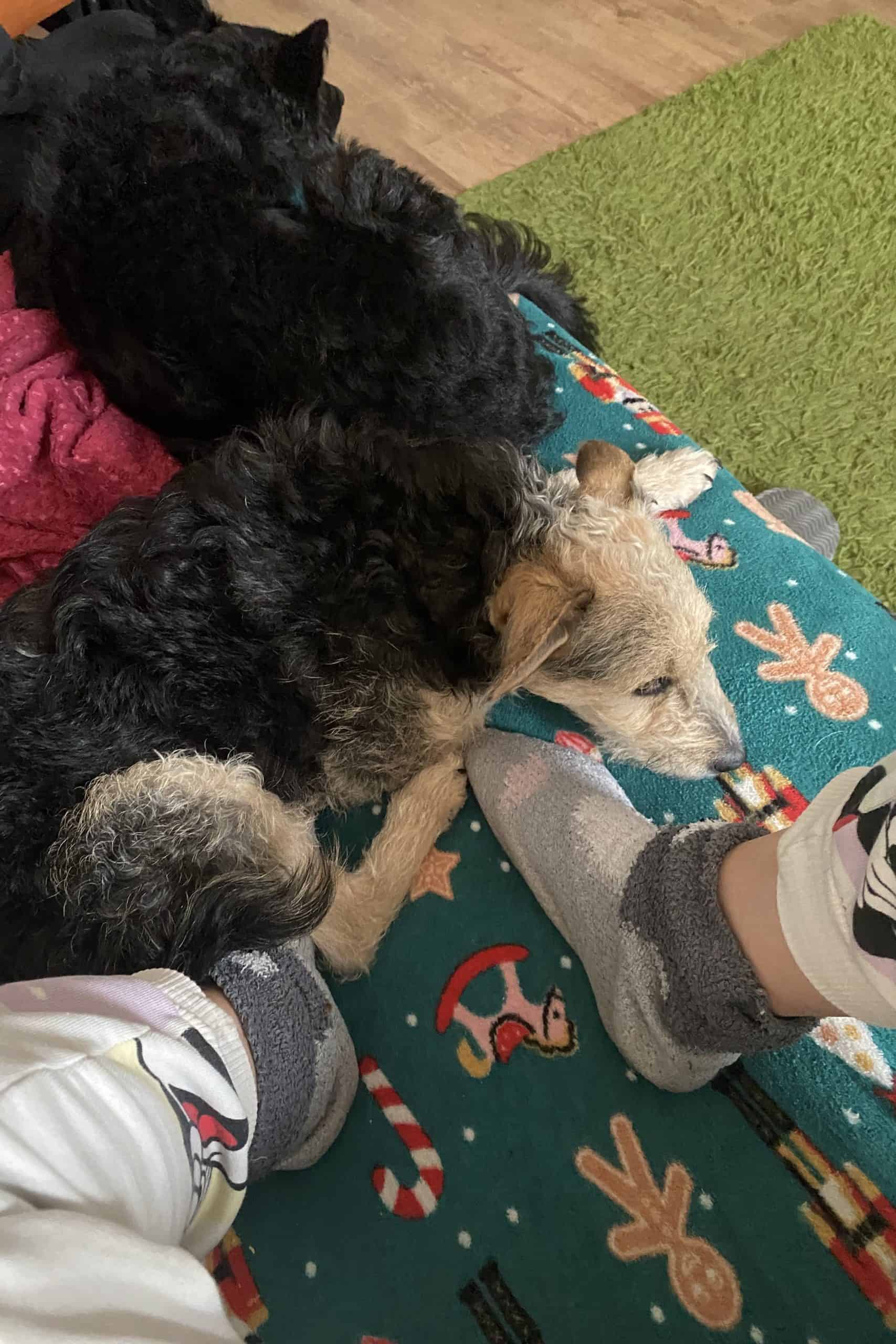 „ Sziasztok! Gondoltam megírom hogy milyen volt nálunk Füge első hete. Az első pár napban Woody kerülte őt, Füge pedig nagyon rám volt tapadva. Nagyon boldoggá tette hogy mindig bújhat, szóval így is tett. Szegény Woodyt állandóan le akarta dominálni, viszont amikor rászóltunk bocsánatkérően a lábunk elé fekszik és elszégyelli magát (ezt most is csinálja). Az első pár napban nem volt hajlandó kitenni a lábát a lakásból. Először lecövekelt a kanapéra, miután kézbe kivittem ha volt lehetősége visszaszaladt, majd az ajtó előtt cövekelt le, végül egyszer a lépcsőházba is. Végül megszokta hogy nem viszem vissza, úgyhogy most már Woodyval együtt izgatottan várja a sétát. Pár nap kellett Woodynak hogy ne kerülje annyira Fügét, most már nagyon édesen játszanak, bár Fügének még meg kell szoknia más kutyák korlátait. Nagyon megnyílt nálunk, emberre állatra nagyon kíváncsi, és mindenkivel kedves, viszont a kutyák reakciójától függetlenül megy oda hozzájuk, Woodyval is nagyon nyomulós volt, de neki már kezdi elfogadni a korlátait, meg természetesen mi is figyelünk rájuk. Az, hogy nem fog enni, felesleges félelem volt, ugyanis nagyon jóízűen eszik, viszont a kajával nem féltő, volt hogy egyikük vagy másikuk előbb végzett és odamentek egymáshoz, de nem volt morgás belőle. Hozzátartozik az is, hogy szófogadó kiskutya. Ha szólunk neki valami miatt megcsinálja. Nem akar kibújni a hámból, nem akar szökni egyébként. Mellettem és Woody mellett sétál, örül ha megyünk, de annak is ha hazamegyünk. Woodyra kicsit féltékeny ha simit kap, pláne ha rólam van szó. Amint odamegyek Woodyhoz nagyon erőszakosan mászik az ölembe, ilyenkor gyengéden odébb tolom hogy várja meg a sorát. Woody szerencsére nem egy féltékeny kutya, és bízik bennünk hogy fegyelmezzük Fügét, úgyhogy nem volt konfliktus egy nagyobb morgást leszámítva a második napon. Összességében jól sikerült az első hét, mindkét kutya boldog, Füge szépen szokik le arról hogy ledominálja Woodyt, de Marcival mi vagyunk a legboldogabbak, nagyon mókásak és édesek együtt. Üdvözlettel Trixi és Marci.”