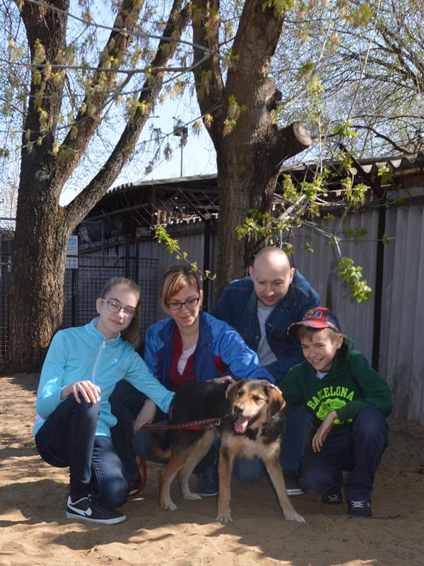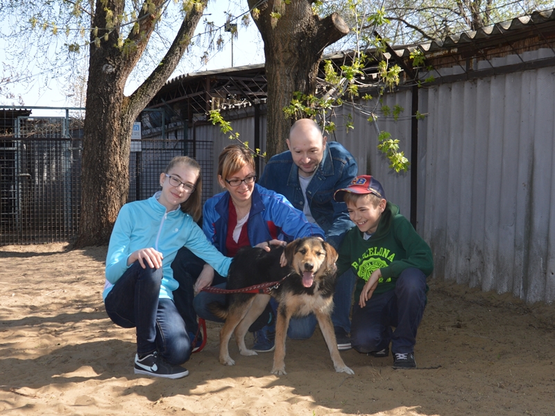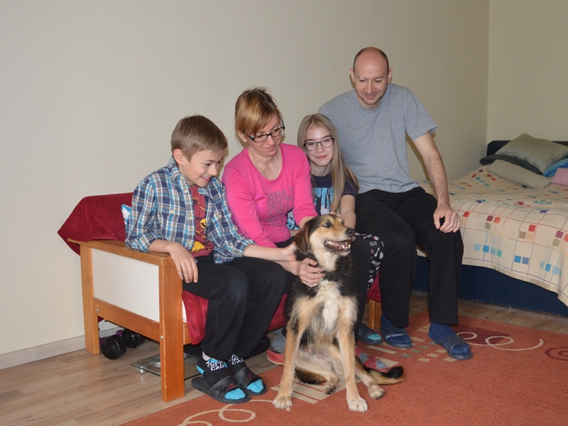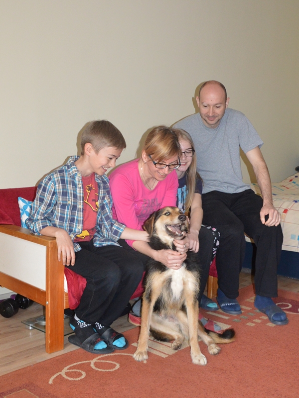 Aztán megkeresett minket egy komoly és elkötelezett család: Gabriella, Péter, és a gyerekek, Blanka és Peti, többször látogatták nálunk Jónást, és megérett bennük a döntés, hogy örökbe fogadják őt. Átgondoltan megvárták a tavaszi iskolai szünetet és ők is szabadságot vettek ki, hogy a szoktatás időszakában a kutyus teljes figyelmet kaphasson. Jónás most már pesti lakásban él a Családdal boldogan. Köszönjük! 🙂