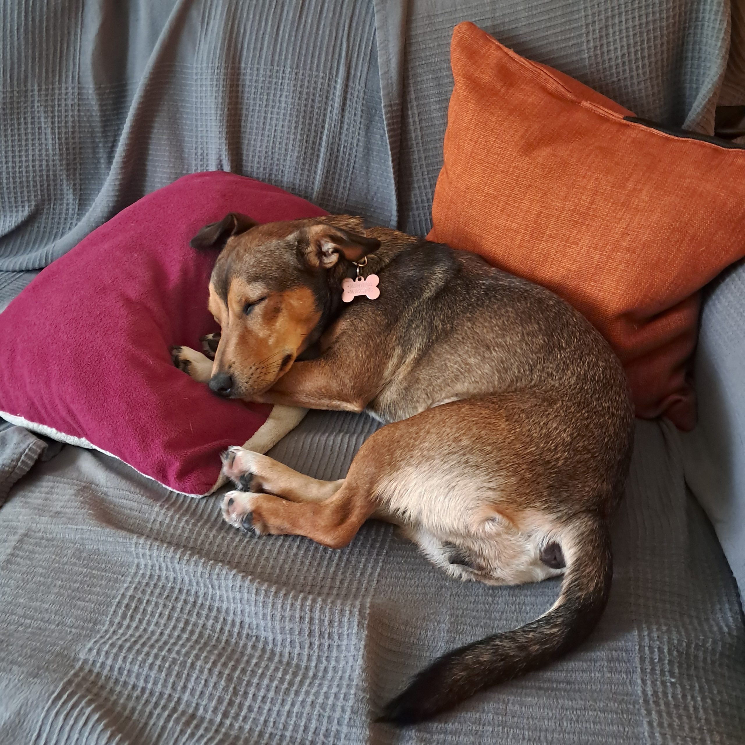 Eleinte hallottam, hogy azt mondogatják: “Mi nem leszünk kanapés kutyás család…” – hát, ezt muszáj volt rögtön orvosolni! Egy óra múlva már a kanapén feküdtem, a gazdik mellett, és azóta is együtt szundikálunk, filmezünk, meg ölelkezünk rajta. Szóval most már hivatalosan is kanapékutya vagyok – pipa!