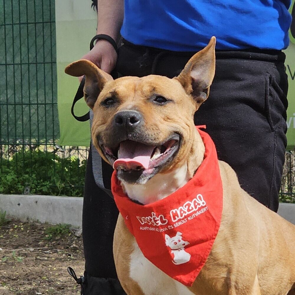 Lujzi másfél éves nőstény amerikai staffordshire terrier, aki áprilisban Pesten kószált, majd az önkormányzat kenneléből alapítványunk vette gondozásába.