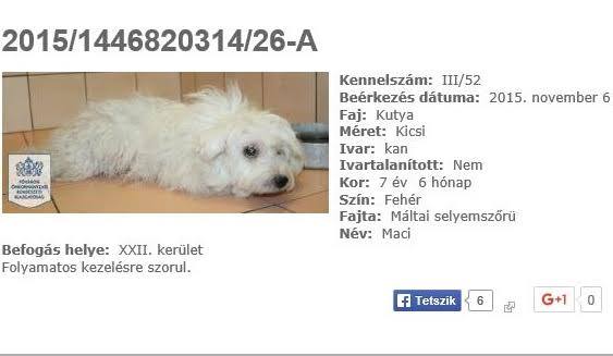 Macit, a máltai selyemkutyust 2015 novemberében adta le tulajdonosa az Illatos útra rendkívül elhanyagolt állapotban. Egész testén gyulladt, vörös, és érzékeny volt a bőre, szemszárazsága hosszú ideje kezeletlen volt. Miután gondozásunkba került, Zsuzsi vállalta ideiglenes befogadását, és ápolását.