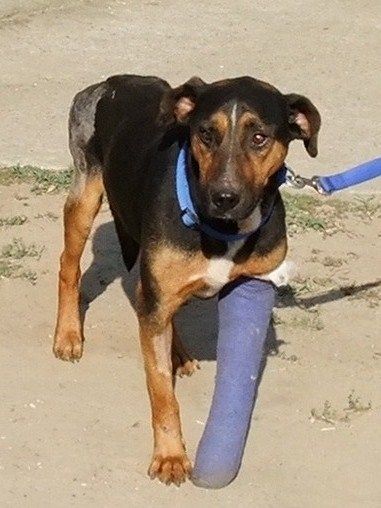 A három év körüli, elgázolt keverék kan kutyát sérülten mentettük az Illatos útról tavaly nyáron.
